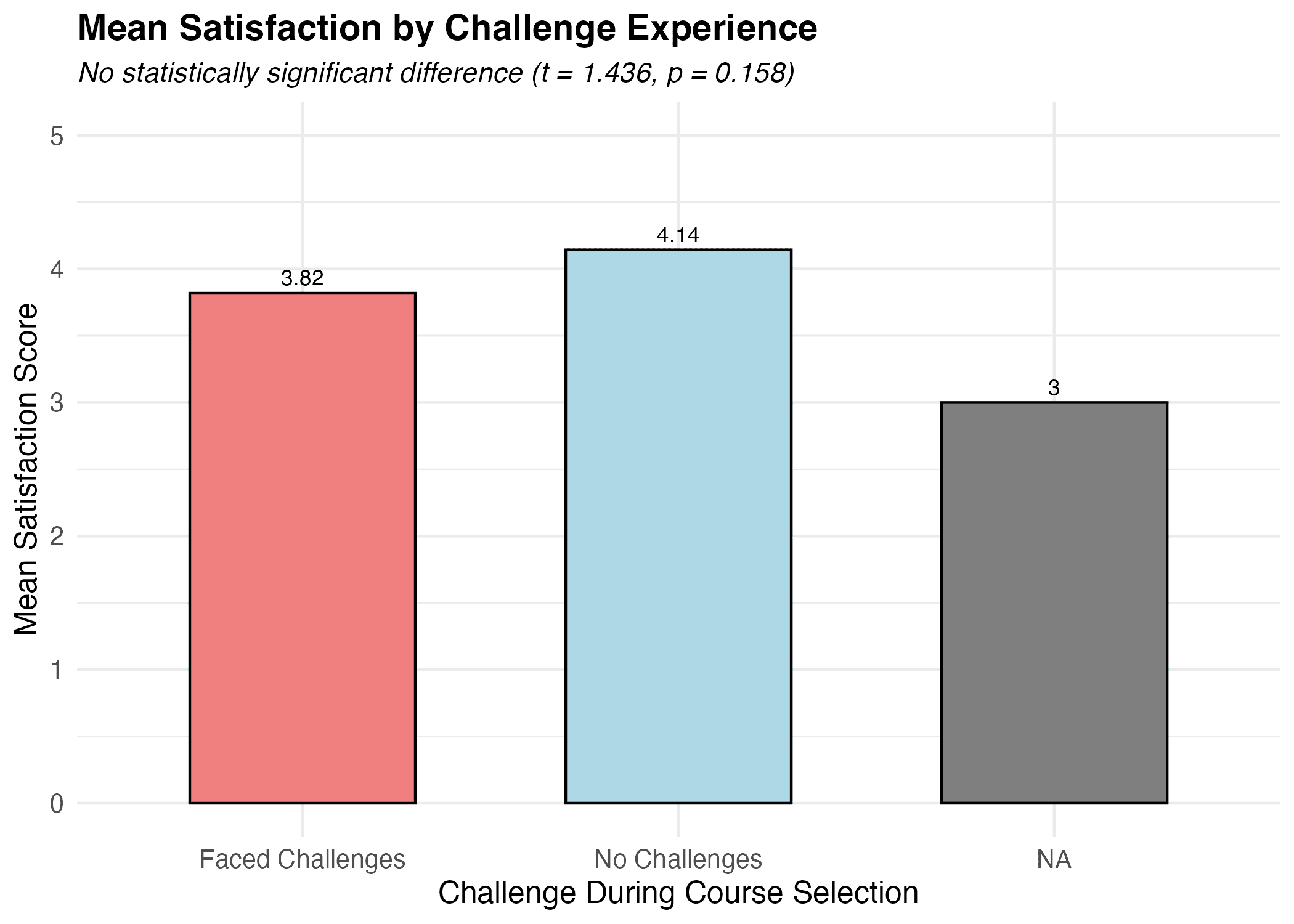Students who faced course selection challenges had slightly lower satisfaction (3.82) than those who didn’t (4.14), but the difference wasn’t statistically significant.