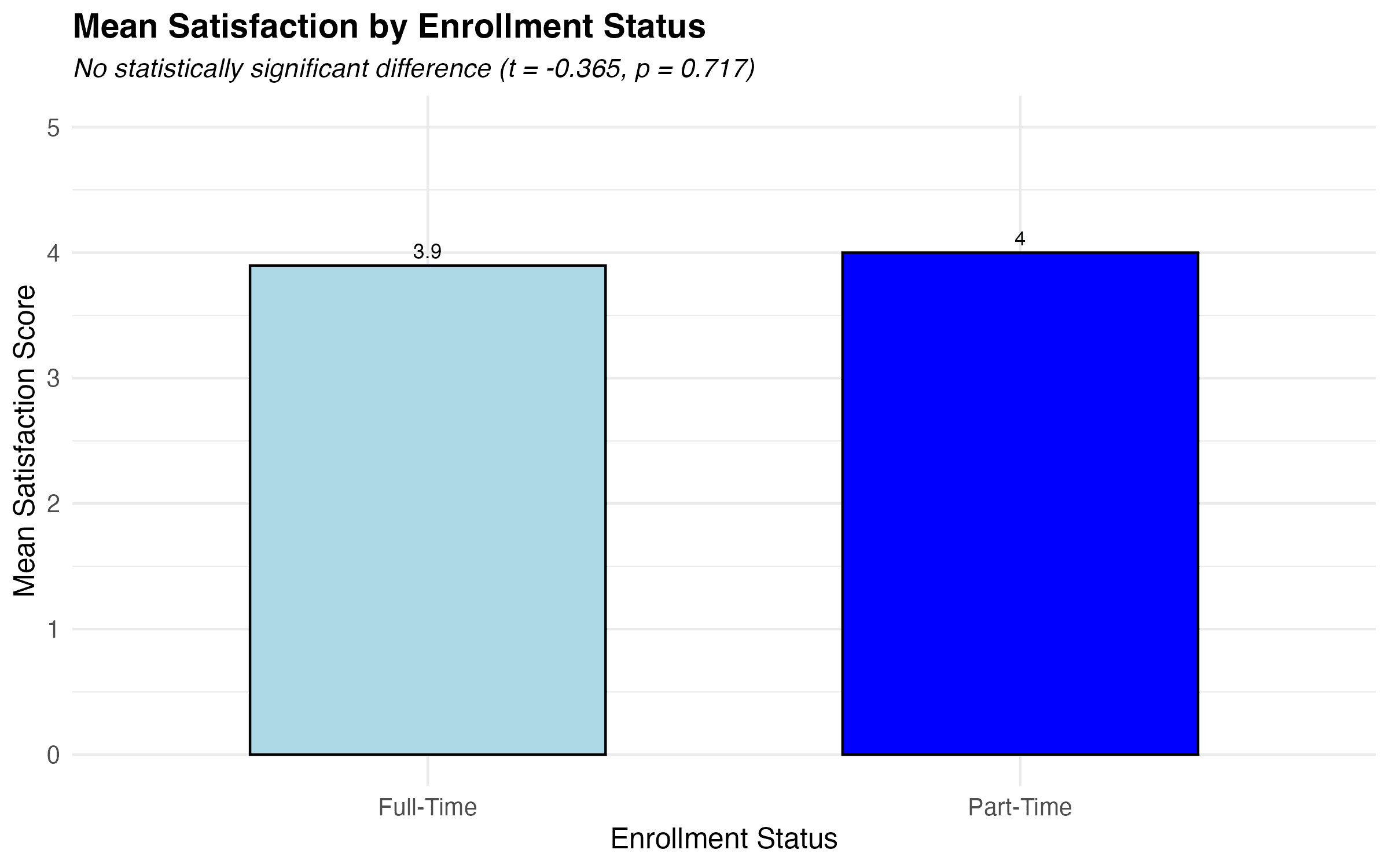 Average satisfaction was 3.90 for full-time and 4.00 for part-time students — not a statistically significant difference.